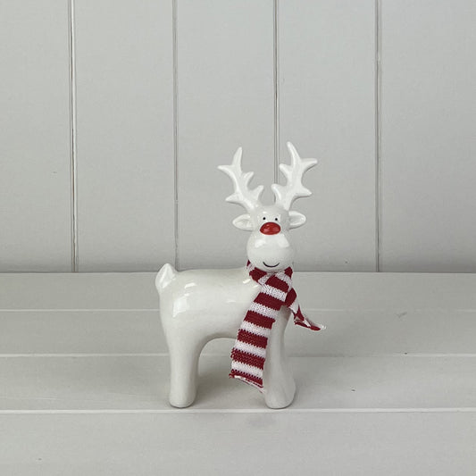 White Ceramic Reindeer Ornament With Knitted Scarf