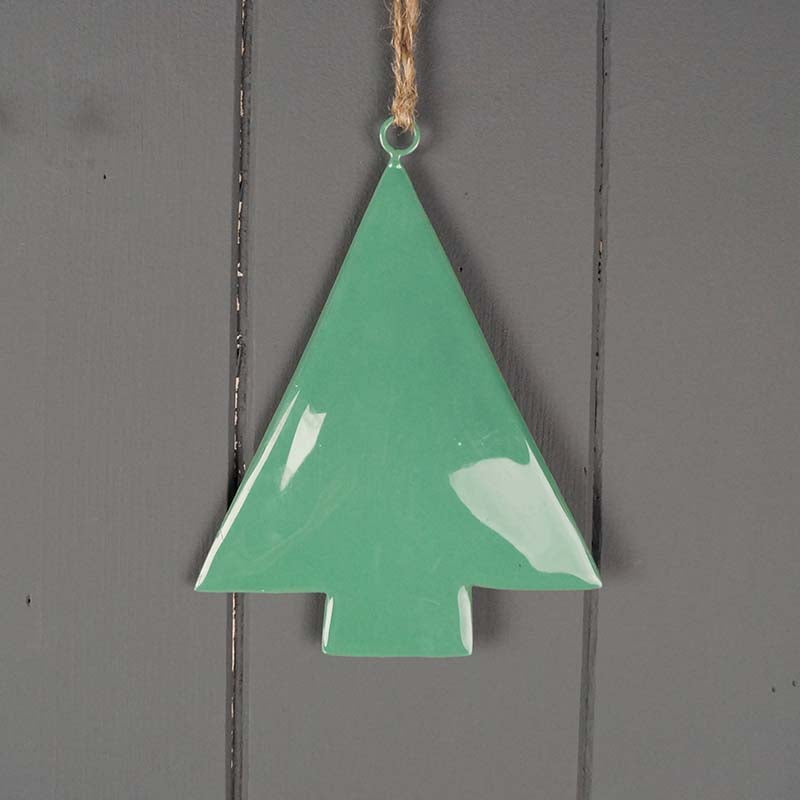 Green enamelled tree ornament designed for hanging, perfect for adding a festive touch to your décor.