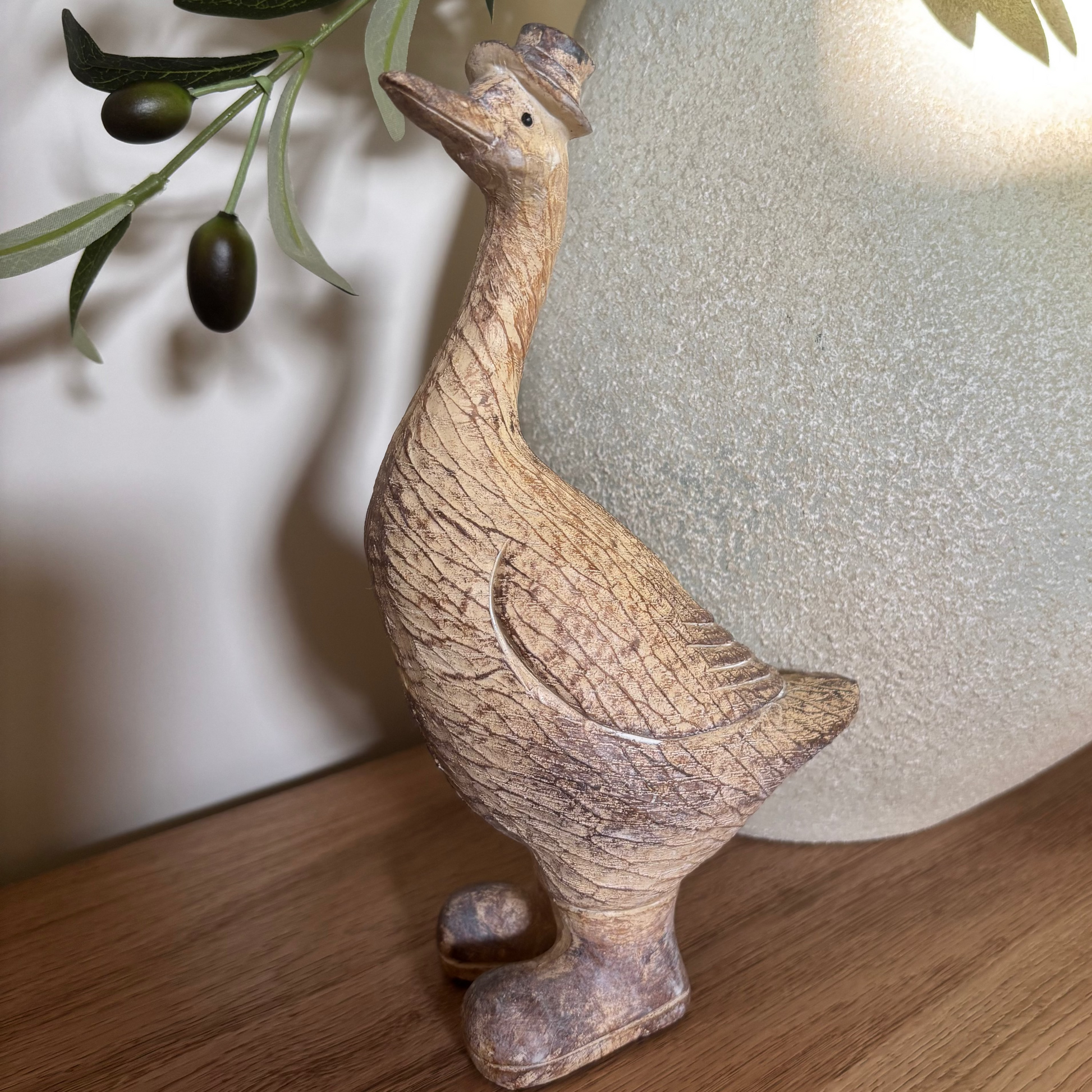 Decorative large white duck with hat ornament made from polyresin and hand painted finish.