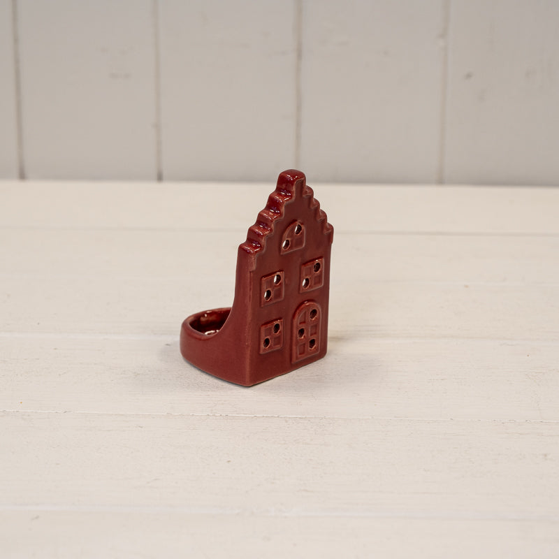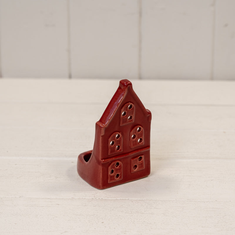 The Red Ceramic Pointed House Tealight Holder adds a charming touch to any room with its striking design. Crafted from durable ceramic, its vivid red finish brightens your décor while safely housing your tealight candles. The pointed house shape creates a cozy, inviting glow as light filters through, perfect for creating a warm atmosphere in your home or as a thoughtful gift for loved ones.