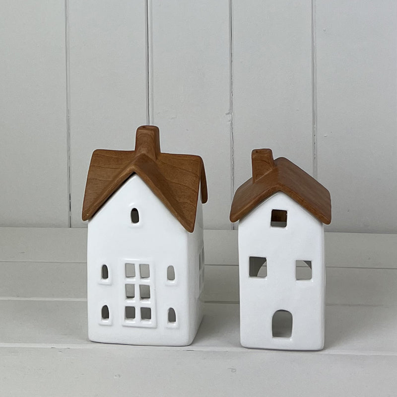 White/Wood Grain Effect Ceramic House Tealight Holder